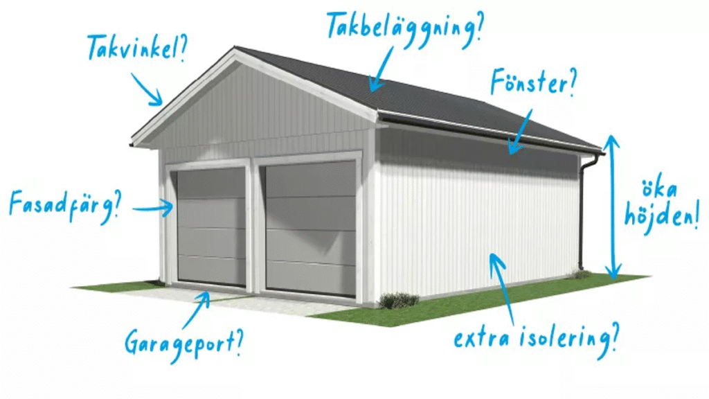 1. Undvik onödiga tillval: Extra fönster, motorstyrda portar eller exklusiva fasadmaterial höjer priset snabbt. Fokusera på funktion – välj bort sådant som inte bidrar till praktisk nytta eller värdeökning.